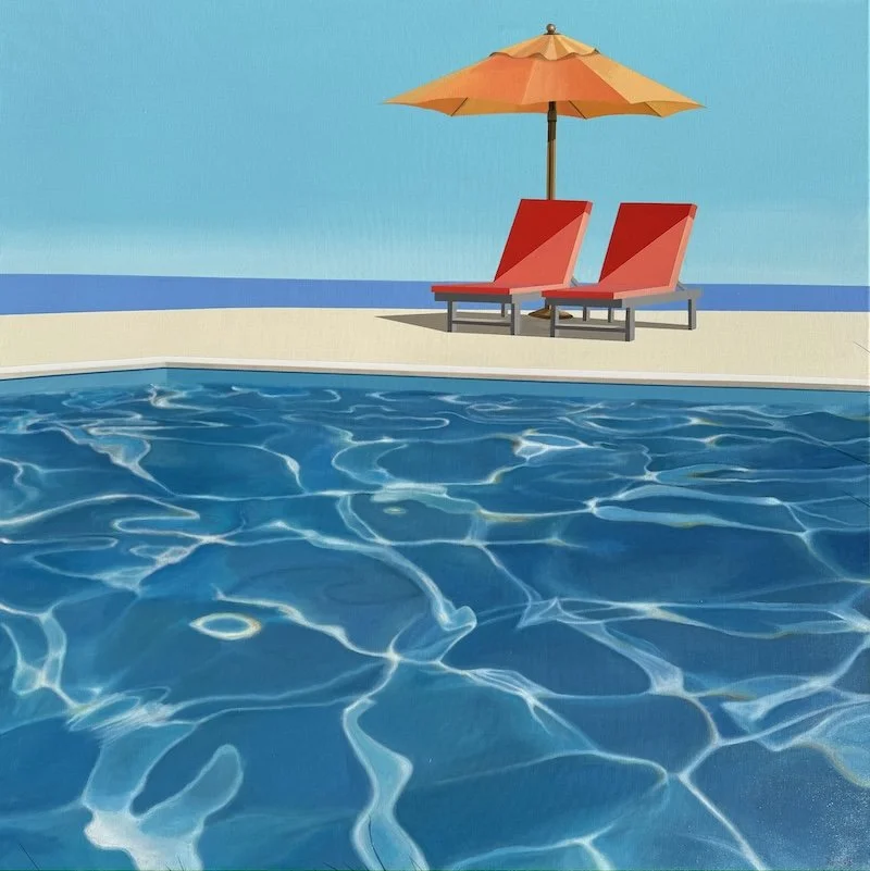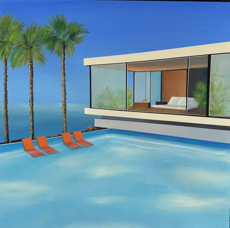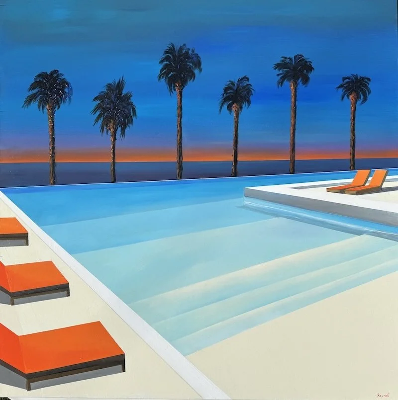 Raynott has retained a colorful nostalgia from his extended stays in California, creating canvases tinged with optimism and sweet contrasts. Dream villas with sleek, modern architecture and pools that sparkle with transparency.