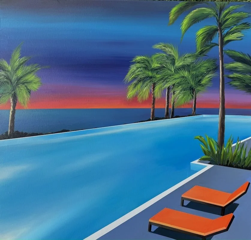 "The process of creating an artwork often starts with the stage of drawing the location of the elements, always with a drawing pencil. Sometimes, there is a watercolor drawing, or it is directly on the blank canvas, depending on the moment. Inspiration often comes from my own photos and drawings of different places. Possible re-creation of existing places, deletion of elements, color changes, and more. Painting is an open book reflecting the artist's soul; optimism, light, and sunny warmth are the messages I want to convey. Hung in contemporary or more classic interiors, my paintings find their vocation there: Being a window open to the outside, often onto the Atlantic or Pacific Ocean."