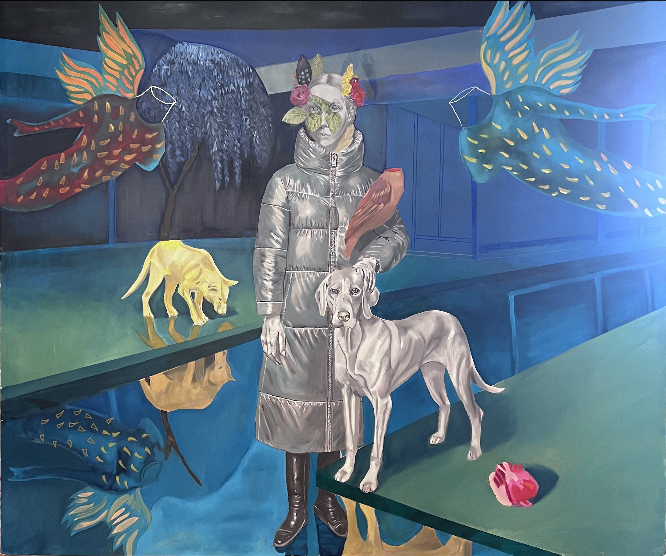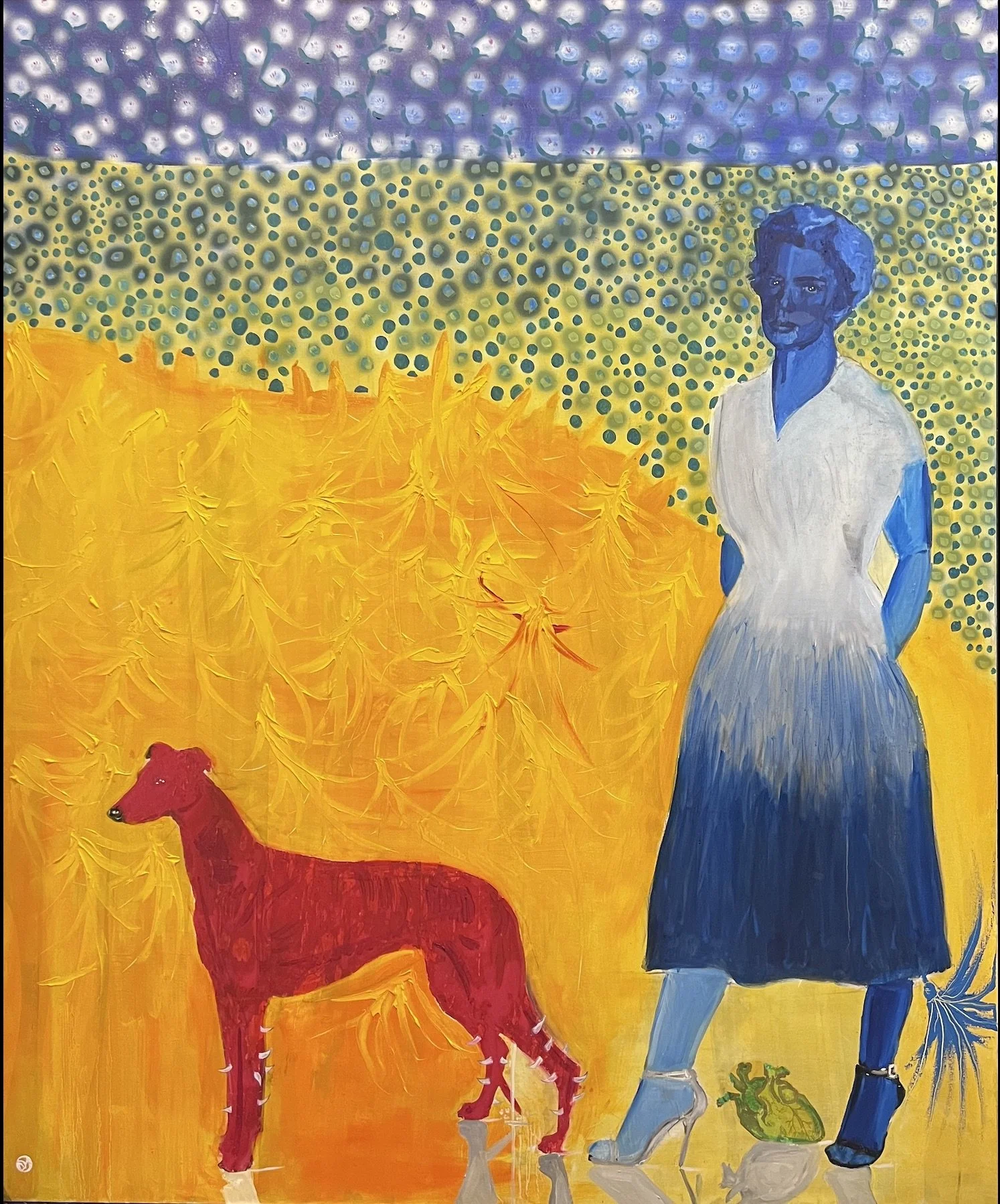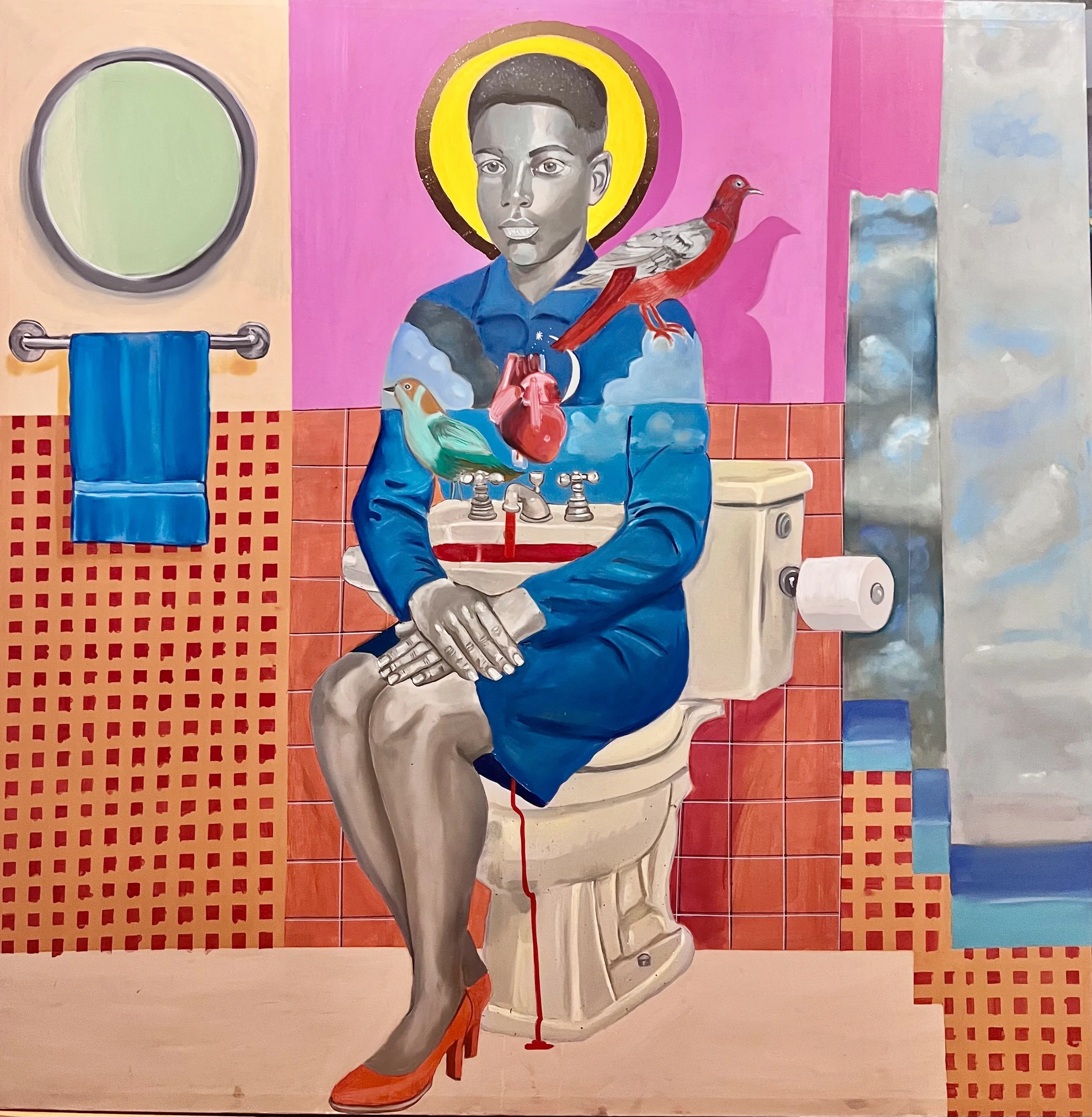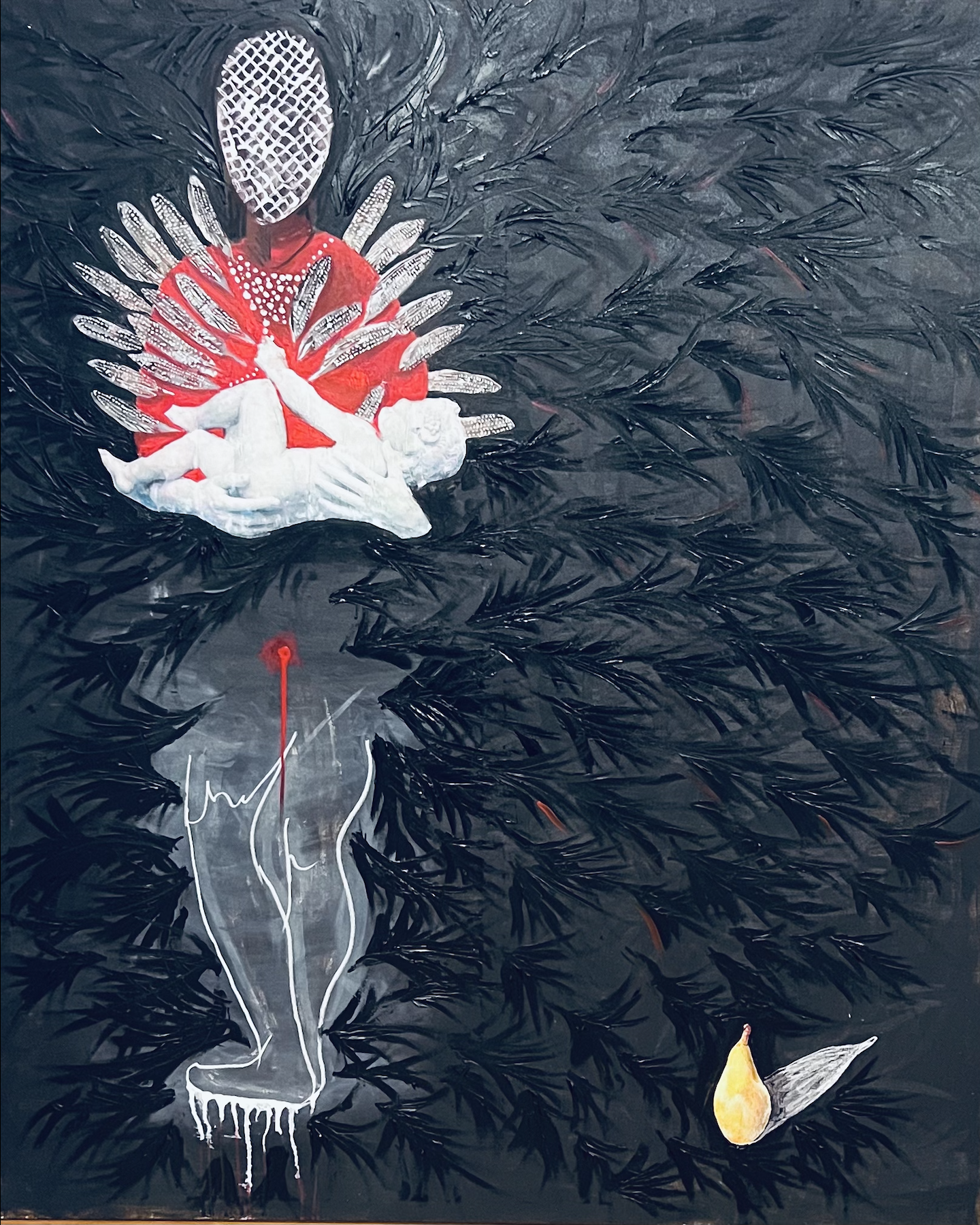 Durand-Methol’s visual language is both devotional and confrontational. Tropical fruits, thorns, halos, crowns, collars, and bodily fluids operate as layered symbols of desire, sanctification, restriction, and liberation. Figures often inhabit expansive black atmospheres that function less as background than as psychological space. Against them, saturated reds, electric blues, and luminous yellows intensify the presence of bodies that refuse categorization.